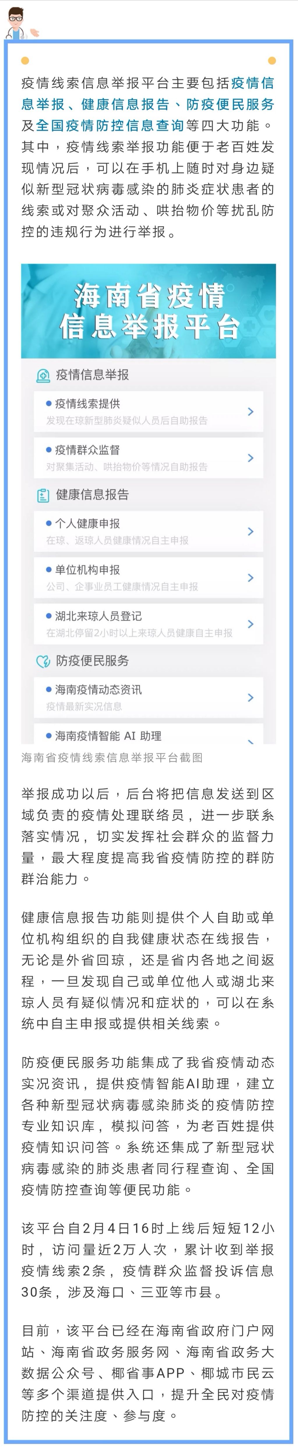 海南省疫情线索信息举报平台 已于4日正式上线